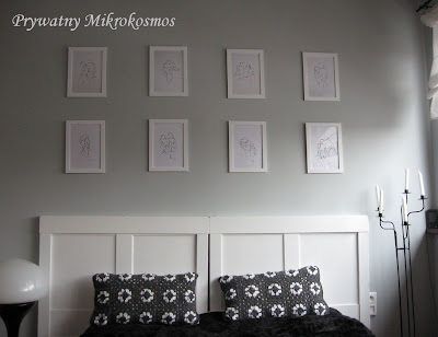 Nad łóżkiem czarne ramki przemalowane oczywiście na biało, narazie z grafikami H.Styczyńskiej, docelowo będą czarno-białe zdjęcia, ale muszę je najpierw obrobić. Czasu mi na to chwilowo brak..